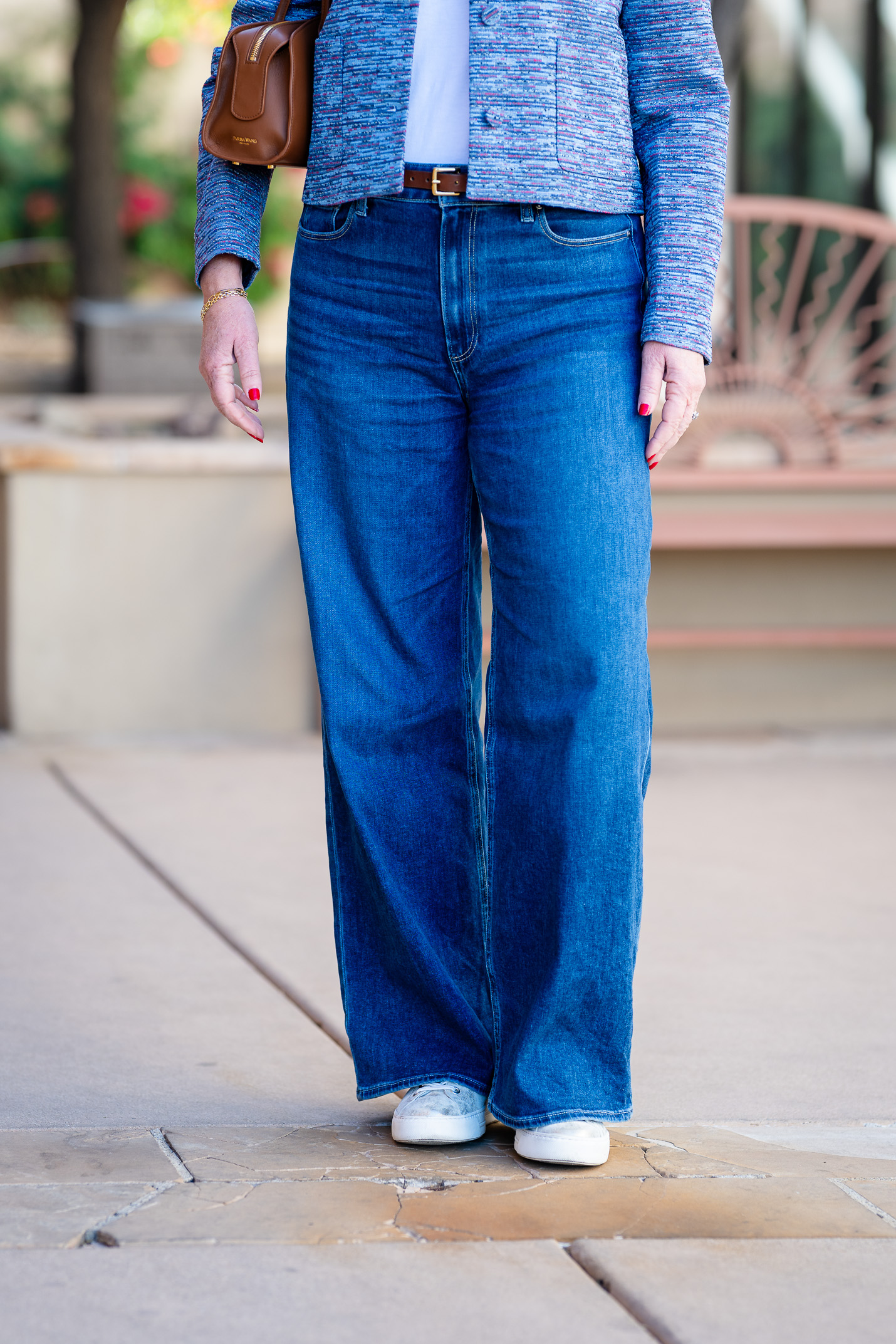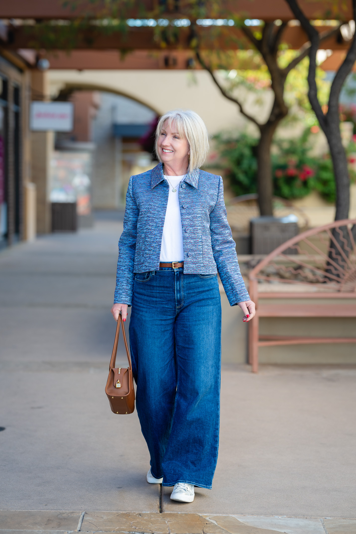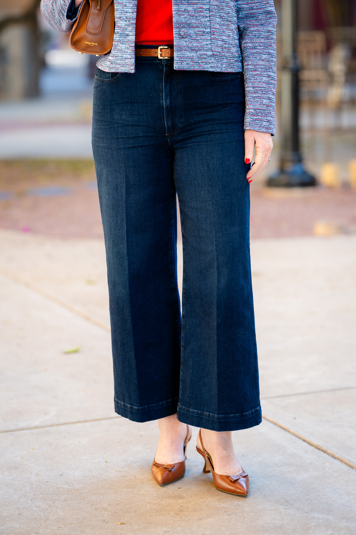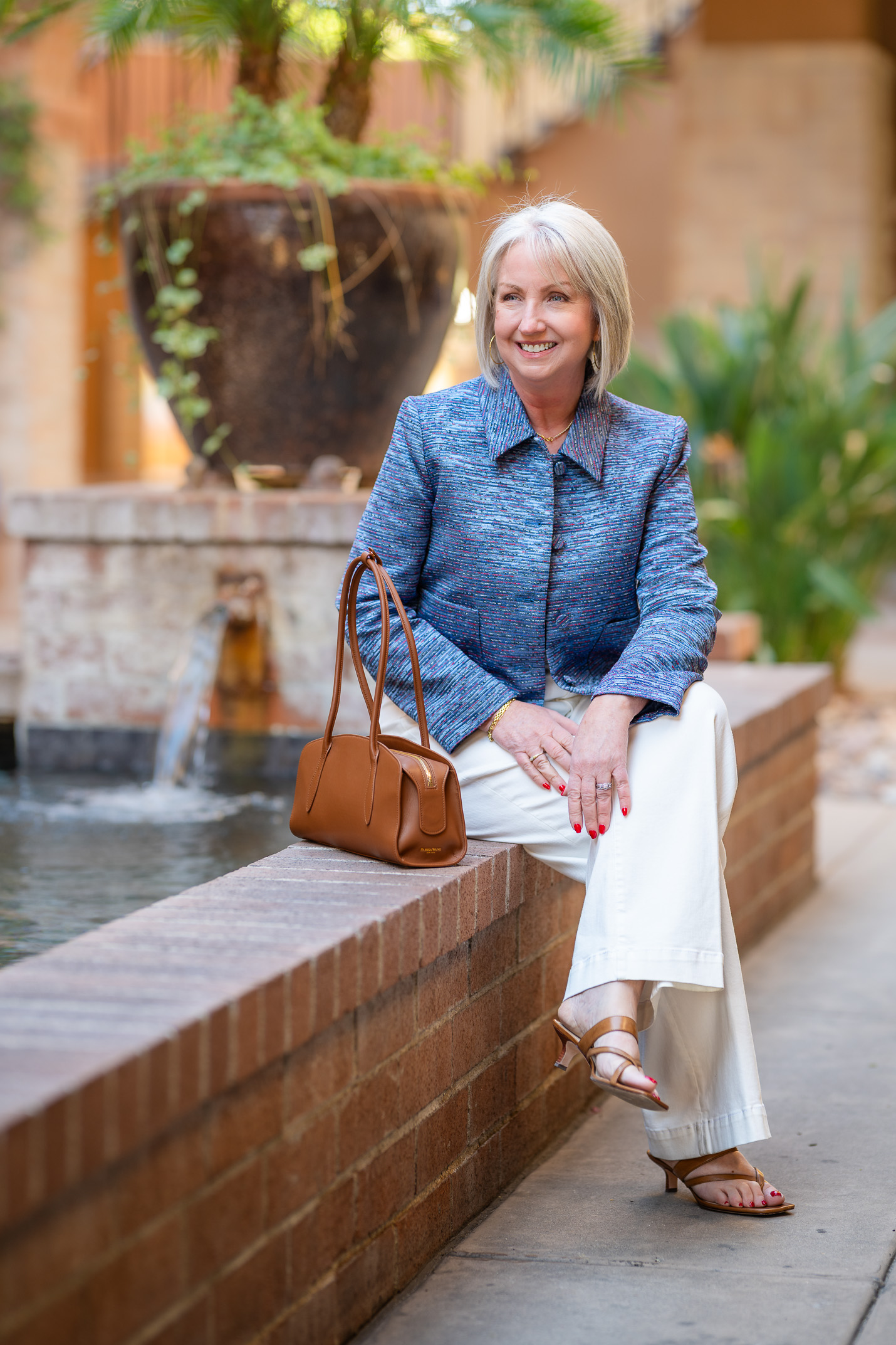 So can I wear this textured tweed lady jacket in three outfits, for three different occasions and with three pairs of shoes? When the jacket arrived I headed straight to my closet to do the math. The lady jacket, which runs true to size for a modern, boxy, cropped fit, features beautiful shades of blue and a striking red thread that runs through it. First I wore it over a navy V-neck t-shirt with a pair of full length white jeans. I completed the look with strappy cognac sandals for a look I would definitely wear to church.