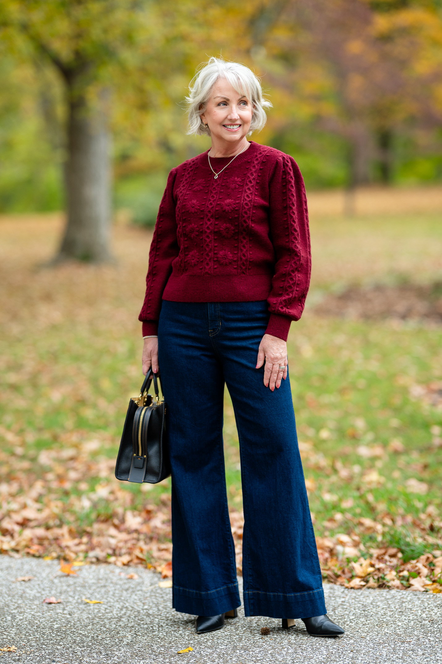 The next component in the winter style formula is a great pair of jeans, pants or a skirt. I like to keep the contrast in intensity low in my outfits, so I chose to wear dark wash wide leg jeans. The wider leg works nicely with the sweater, which features a not-too-long, fitted waistband. My exact jeans are no longer available, but J.Crew has updated them with these, which are currently marked down. They’re available in petite and tall sizes, too.