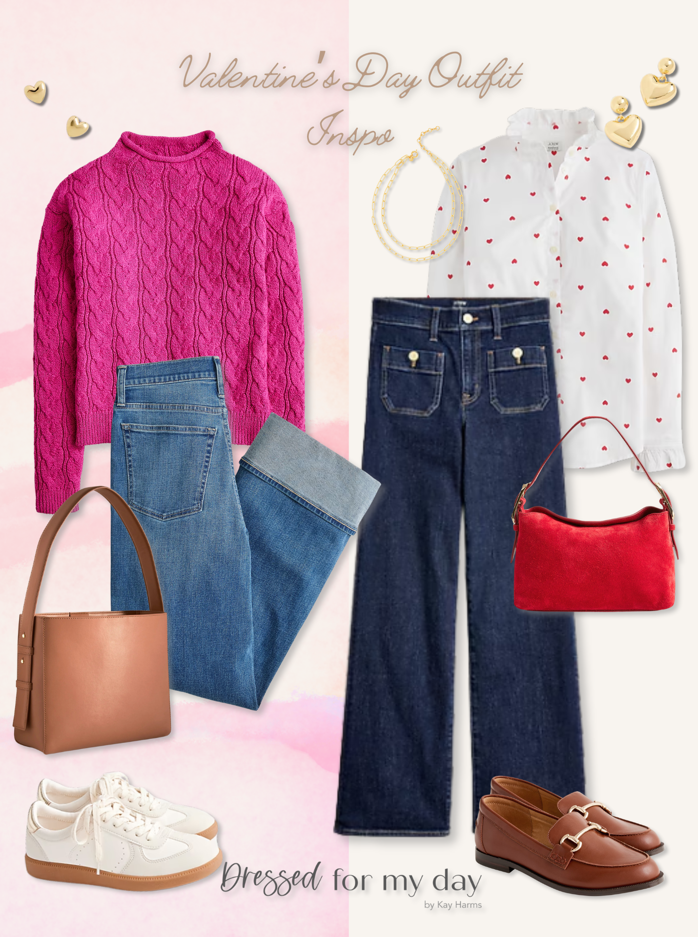 The outfit I’m wearing here is one I shared last year in this blog post. So these exact pieces are not available. But I’ve shared similar options in the Valentine’s Day outfit inspiration boards below. I’ve linked all of those items in the captions underneath each board. And I also have a shopping widget at the bottom of the post with these and other ideas.