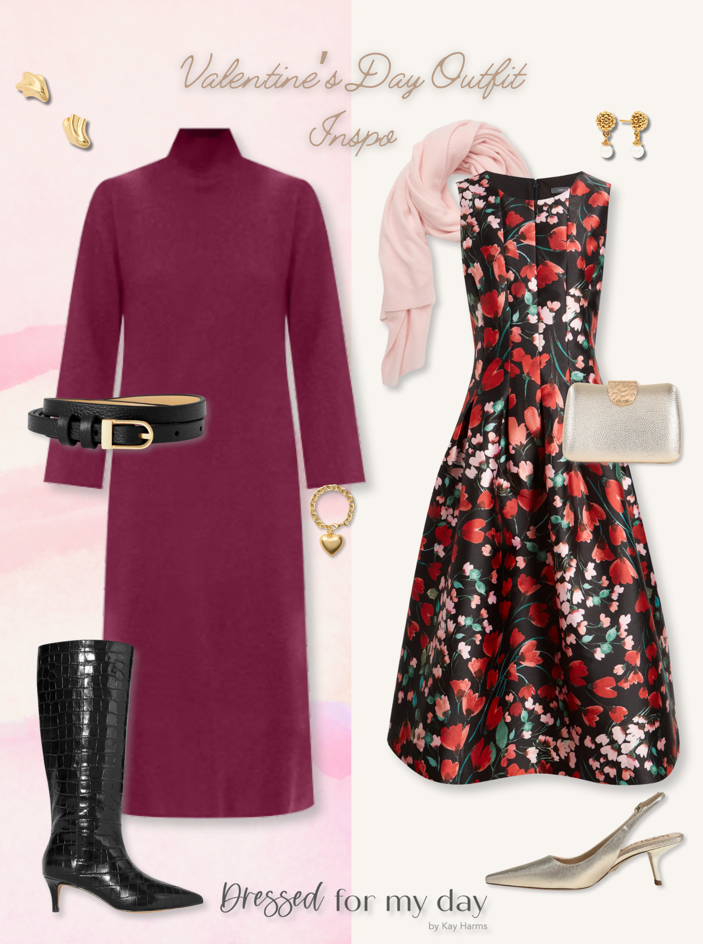 Celebrate Valentine’s Day with your grandkids in one of the comfortable jeans outfits above. They’re smart and polished, but also cheerful and comfortable. But if you need Valentine’s Day outfit inspiration for a nice lunch out or dinner date, check out the dress combinations below.