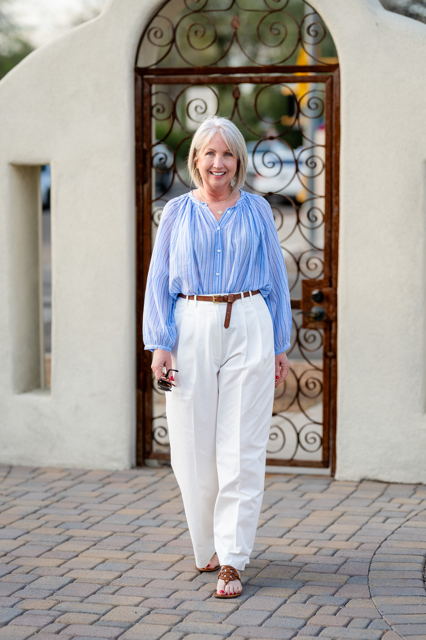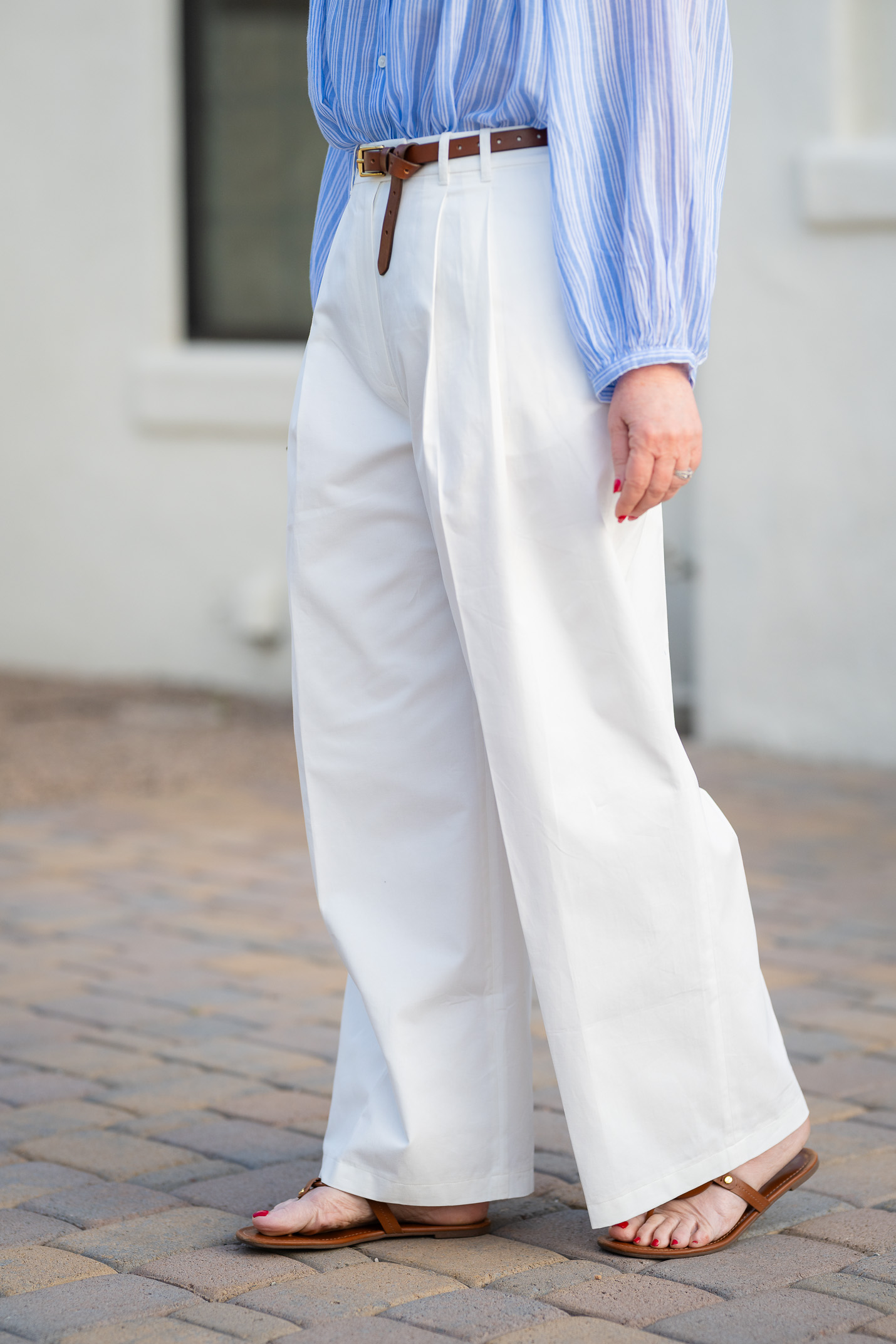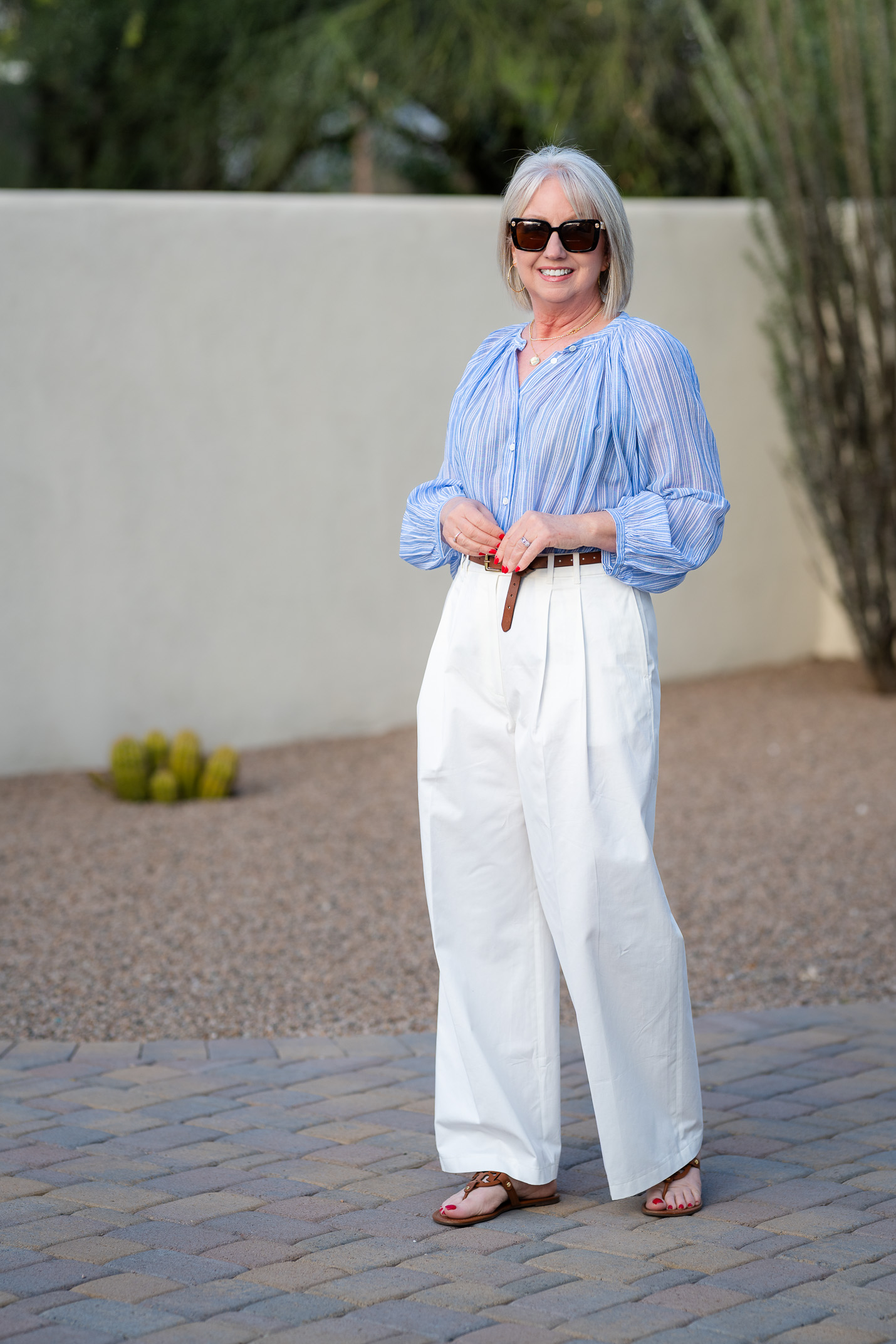 When I decided to purchase the soft, sheer and billowy Jonie top along with the coordinating Lavona drawstring pants you’ll see below, I knew that I would also need to be able to mix those distinctly Dôen pieces with more conservative and traditional options. I didn’t have any classic white trousers, so I purchased the Lisa pants, shown above. These tailored wide leg trousers in 100% cotton twill reflect my personal style aesthetic beautifully, but they bring something new and fresh to my wardrobe for 2026.
