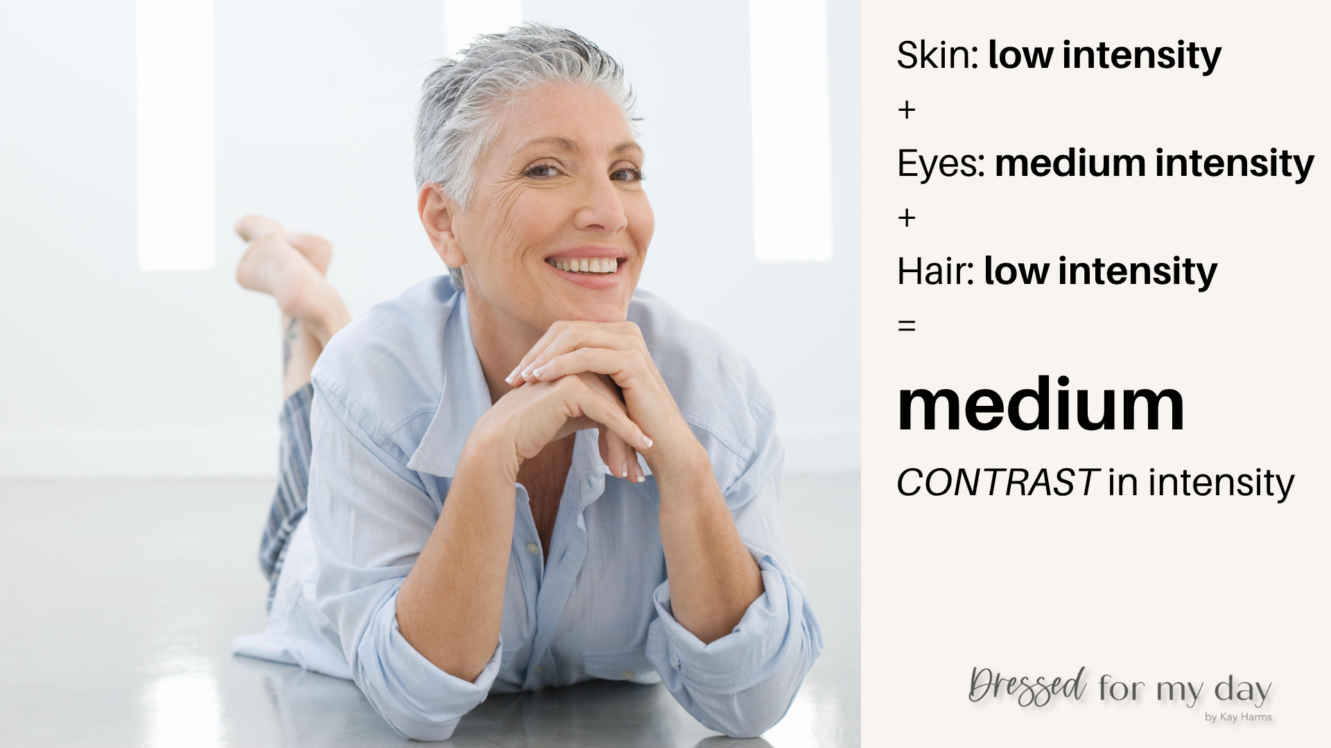 The first step to dressing for your contrast in intensity is to determine the intensity of your personal features: your eyes, skin and hair.