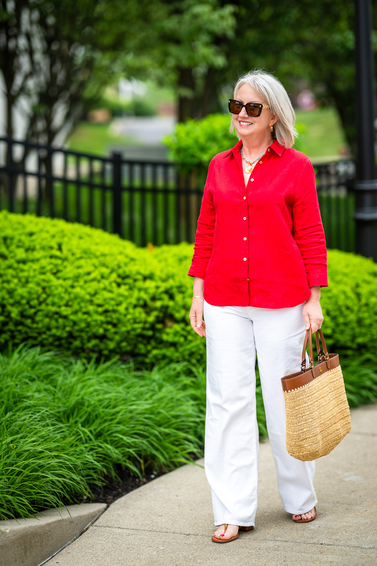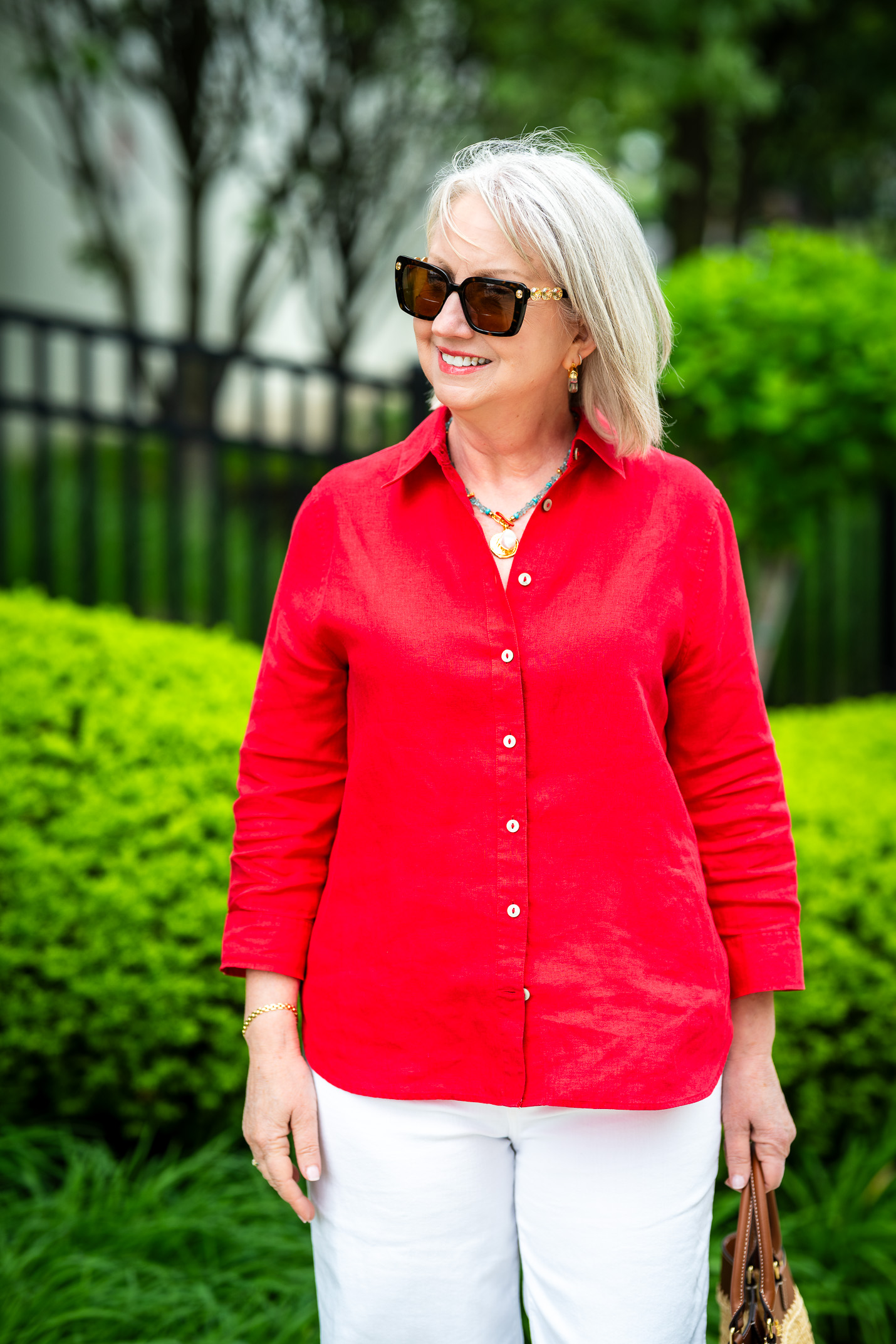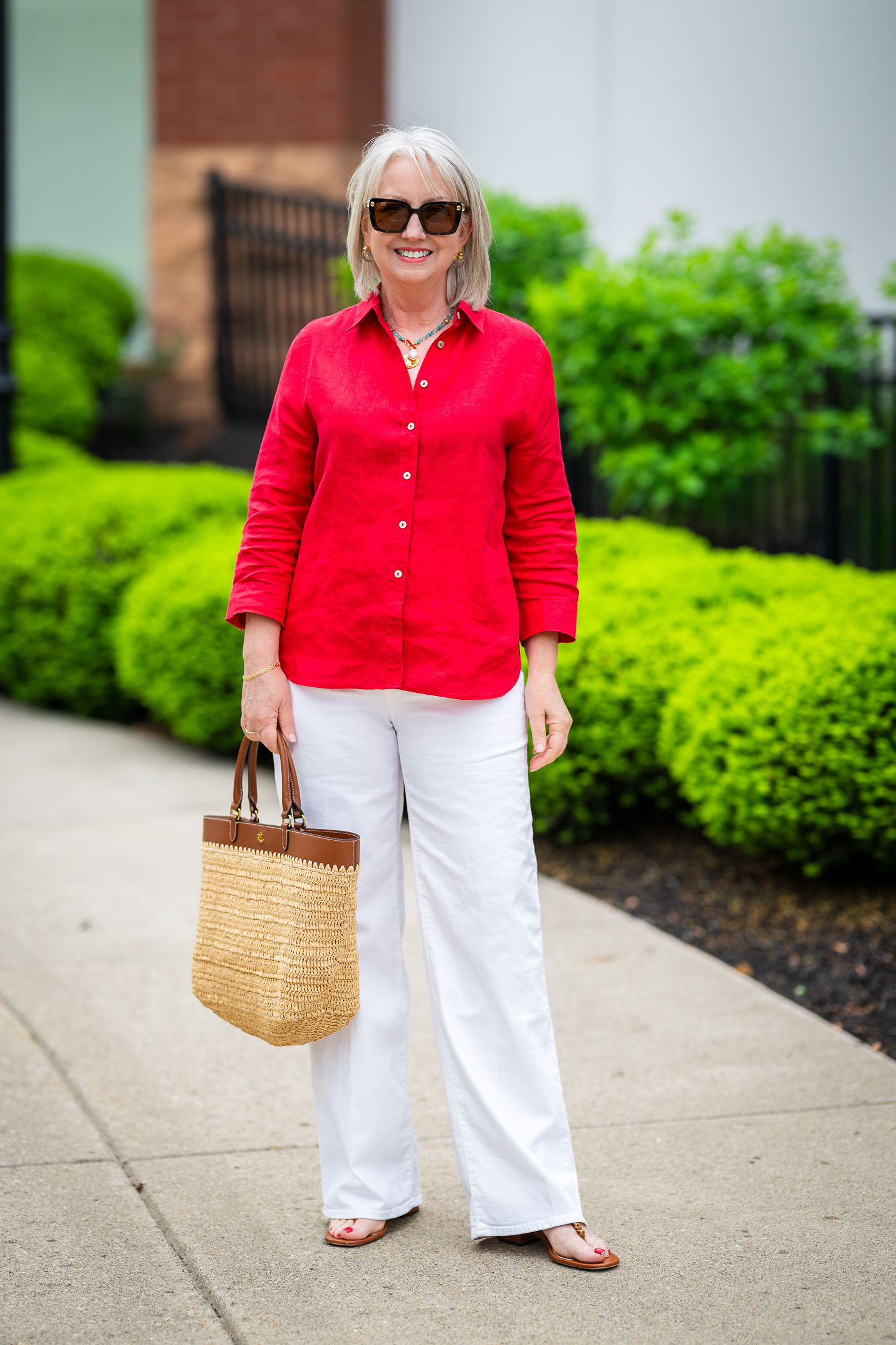 Here I’m wearing a vibrant red no-iron linen shirt with full length white jeans. The contrast is stark and bold. It’s not ideal for my coloring, but it will work for so many women with more contrast in their personal features.