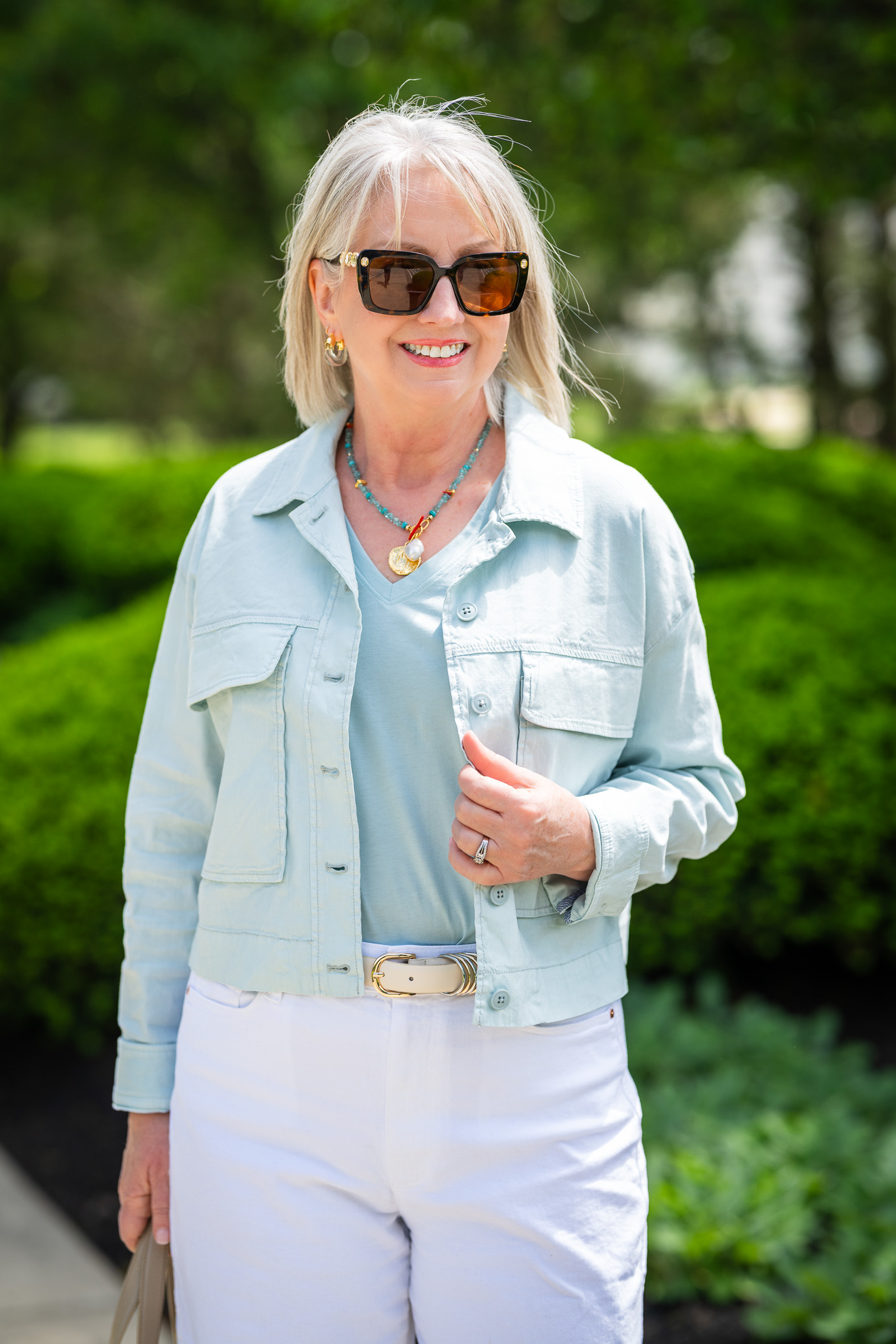 But if you have low contrast in intensity and you want to wear a medium intensity top with your white jeans, I suggest doubling up the one color in multiple places, like I did here with my jacket and top. Then I even wore the same color in my earrings and necklace.